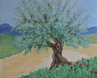 50 x 60, Gemengde techniek op linnen, olijfboom met klaprozen in de Provence. Dit schilderij is verkocht.